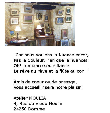 Bienvenue sur le site "moulia.com" Nous avons le plaisir de vous présenter notre travail que vous avez peut-être découvert à notre atelier situé: 4, Rue du Vieux Moulin 24250 DOMME 05.53.28.78.51 / 06.86.27.27.94 Vous accueillir sera notre plaisir afin de partager un moment le plus agréablement possile, A très bientôt